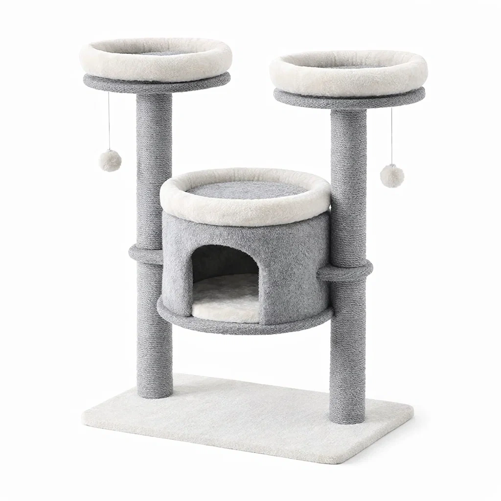 Arbre à chat en bois et peluche beige avec niches et jouets suspendus 60x40x120 cm
