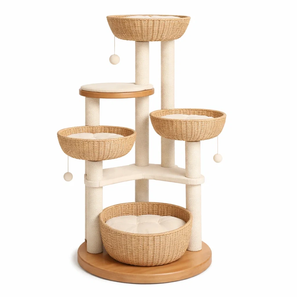 Arbre à chat en osier et bois avec coussins en coton