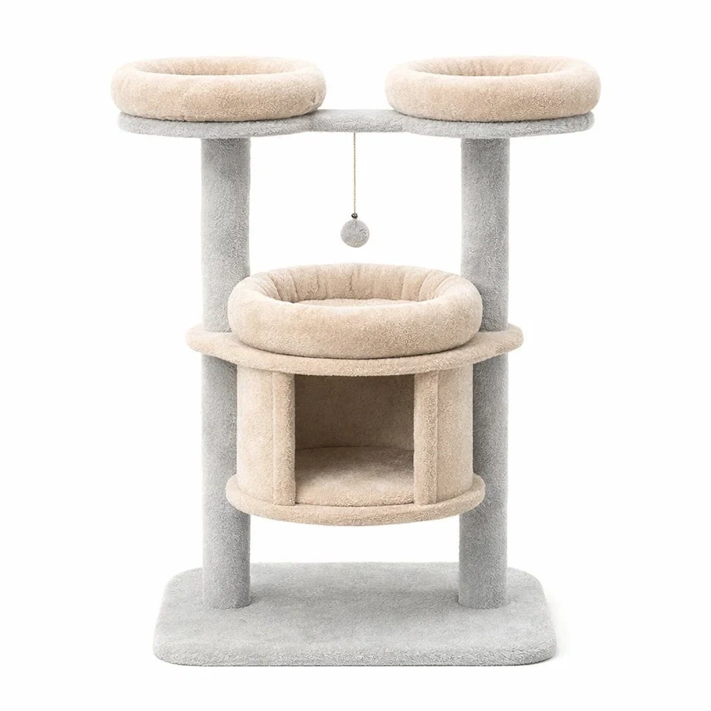Arbre à chat en bois et peluche beige et gris