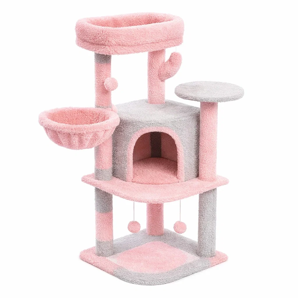 Arbre à chat en MDF avec plateformes et peluche gris rose