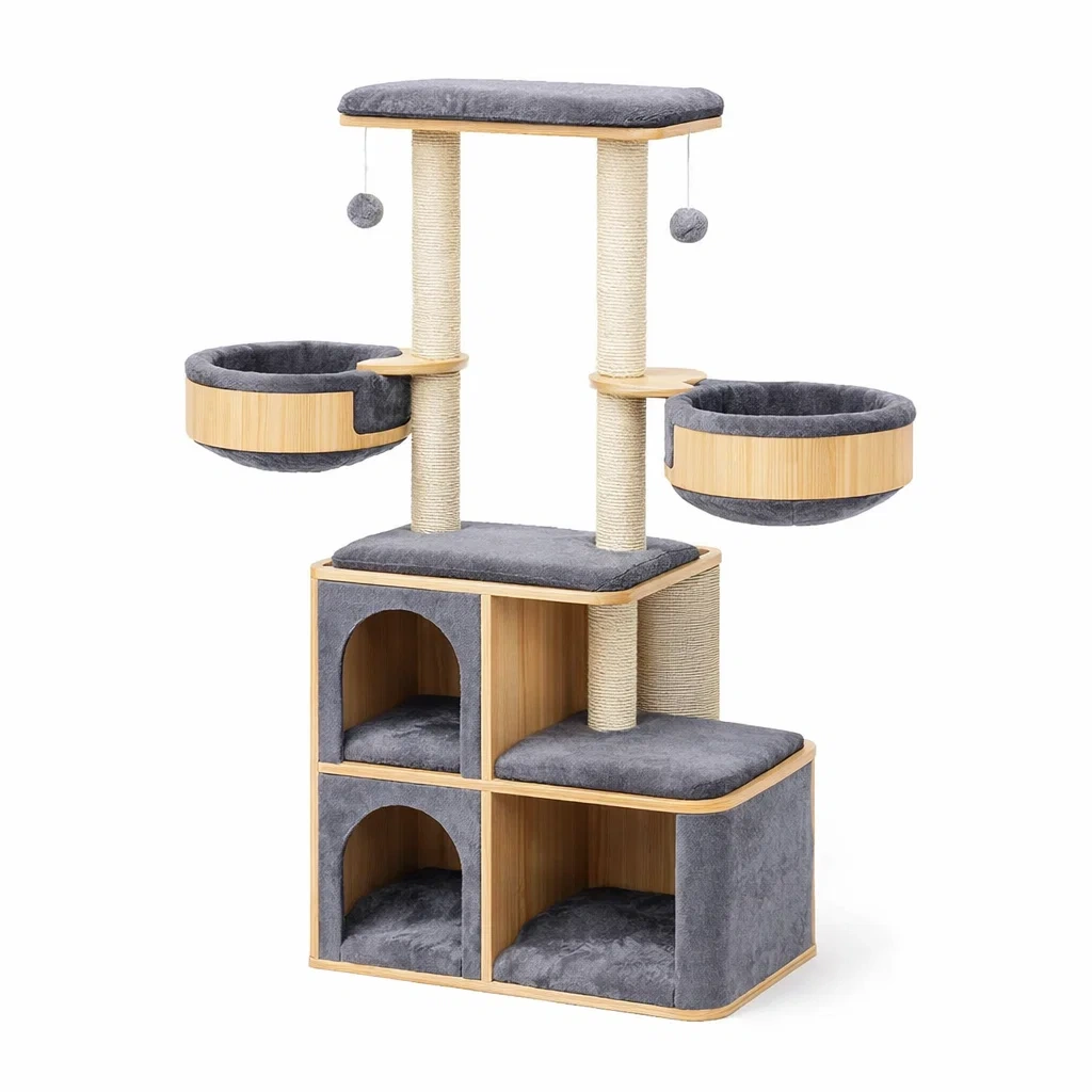 Arbre à chat en bambou et polyester gris avec corde en sisal