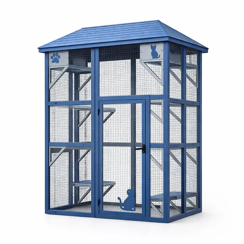 Enclos pour chat en bois et grillage métal bleu avec étagères