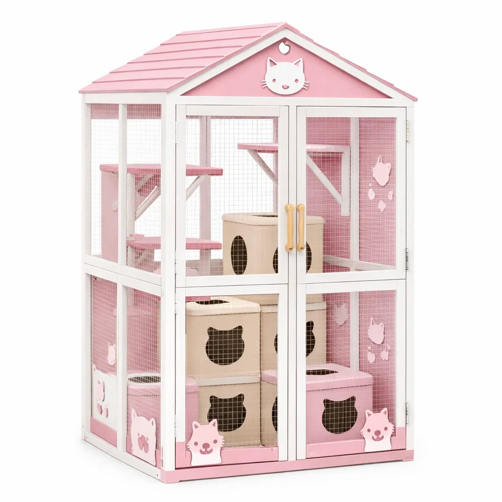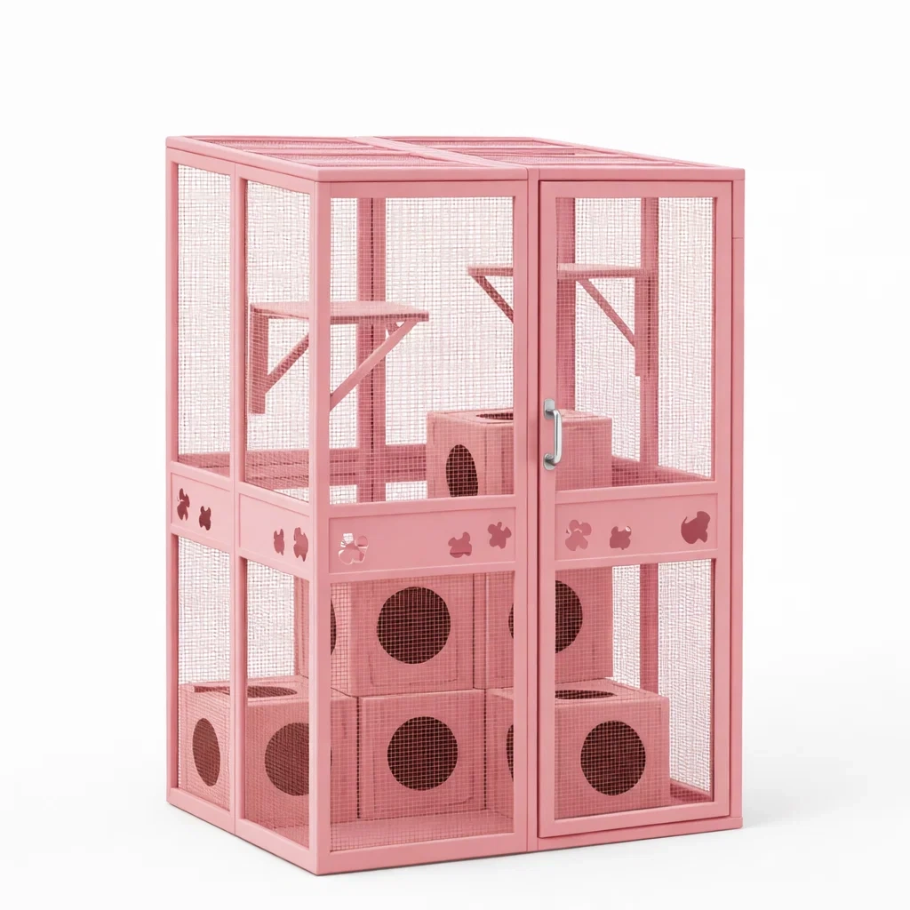 Enclos pour chat en bois et métal rose avec plateformes et griffoirs
