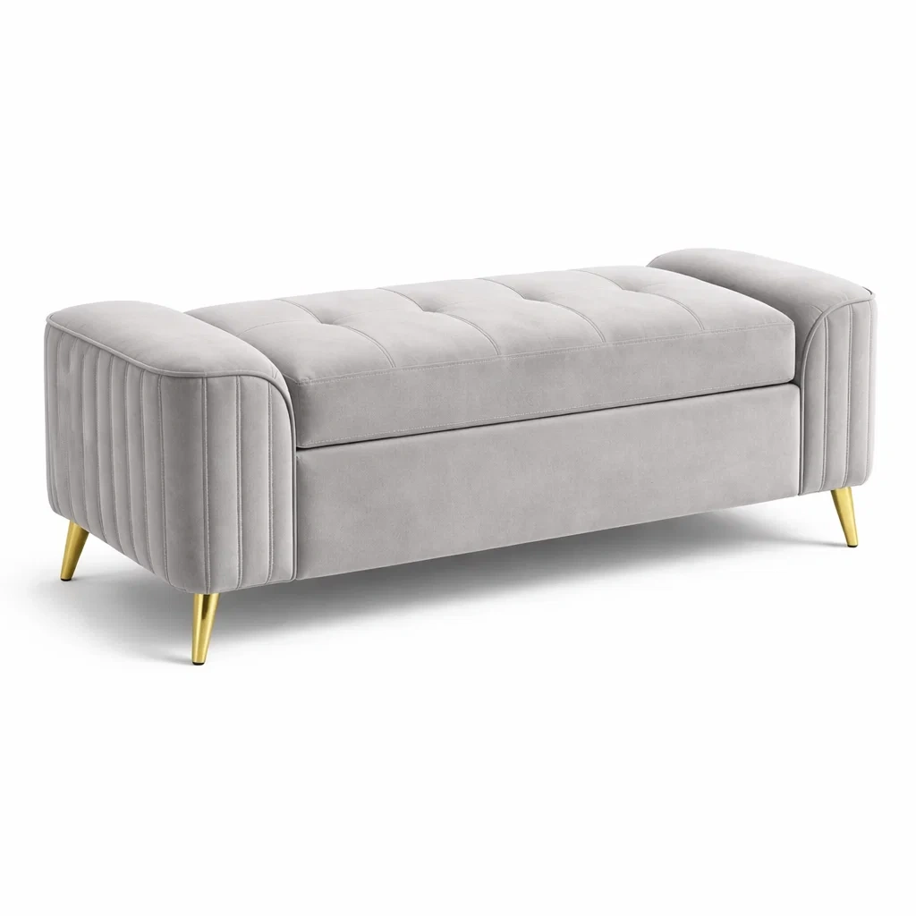 Ce banc de rangement est fabriqué en velours polyester, offrant une assise moelleuse. Les pieds sont réalisés en acier inoxydable doré.