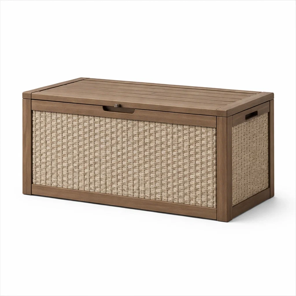 Ce coffre de rangement est doté d'un cadre en bois d'acacia massif et d'une surface en résine tressée synthétique. Ses dimensions sont de 120 cm de longueur, 50 cm de largeur et 60 cm de hauteur. Il dispose d'une capacité de stockage de 250 L et s'ouvre grâce à un couvercle rabattable.