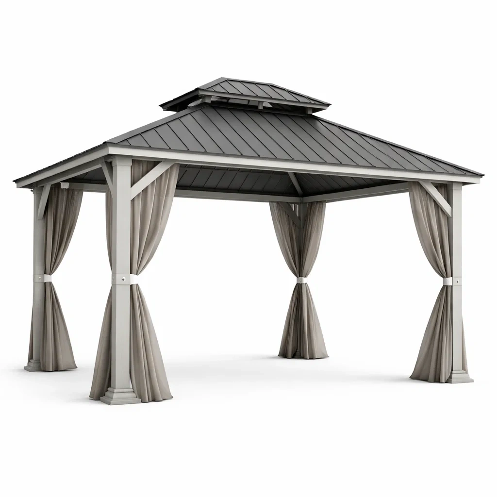 Pavillon en acier avec toit double et rideaux en polyester