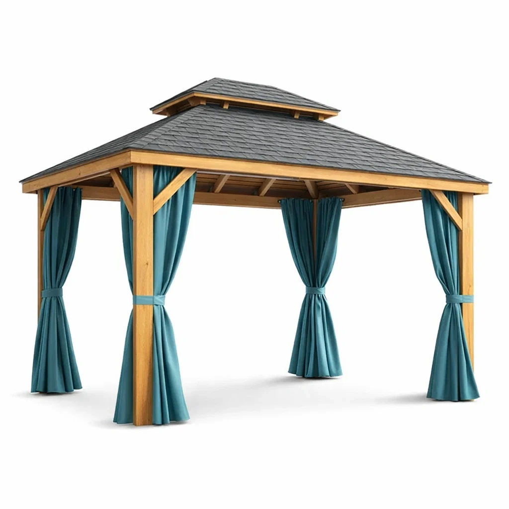 Pavillon en bois avec rideaux en polyester et toit en bardeaux d’asphalte 400x300x300 cm