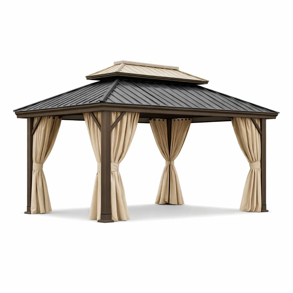 Équipé de rideaux, ce pavillon nécessite un assemblage avec des outils adéquats. Nettoyage à l'eau savonneuse recommandé. Ne pas utiliser en cas de neige lourde.